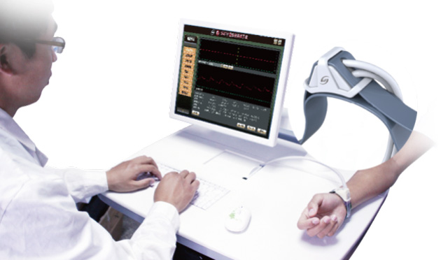 中醫脈象診斷系統:利用計算機,通過袖帶式傳感器,傳感器自身重量≤50克,在橈動脈寸,關,尺三個部位檢測脈象信號,模仿中醫醫師指法,(傳感器Φ8圓形)更準確的按照中醫舉、按、尋的診脈過程,浮、中、沉散布全自動氣體加壓取脈,采集八個不同壓力段的脈象波形自助選擇佳壓力波形,并將脈象的位,數,形,勢和脈圖的各項參數自動分析,以判定脈象信息,用于臨床脈象檢測。